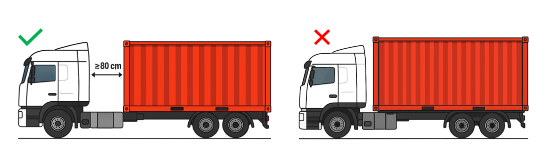 O veículo deve possuir uma distância mínima de 80 centímetros entre a traseira da cabine ou estruturas do veículo e a frente do contêiner, proporcionando condições seguras para as operações de carga e descarga.