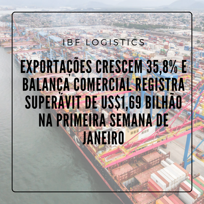 As exportações na primeira semana de janeiro cresceram 32,7% e chegaram US$ 6,25 bilhões, enquanto as importações diminuíram 3,6% e totalizaram US$ 4,56 bilhões.